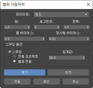모따기는 캐디 컨트롤 사용이 설정되었을 때는 캐디 인터페이스를 사용하고, 해제되었을 때는 표준 모따기 설정 대화상자를 사용합니다. 캐디 컨트롤 사용에 대한 자세한 내용은 편집 가능한 폴리 설정의 캐디 인터페이스 항목을 참조하십시오.