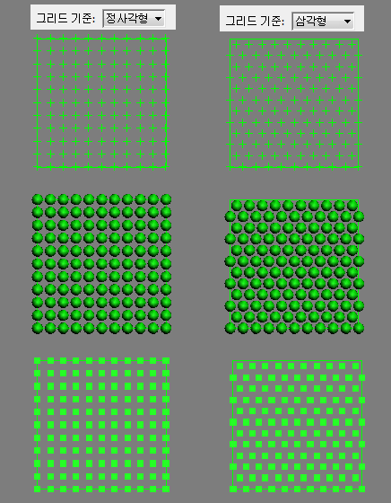 - 단일 그리드 레이어에서 사각형 또는 삼각형 레이아웃으로 파티클을 압축하는 방법을 선택합니다. 두 가지 선택 사항은 다음 그림의 위에서 보이는 대로 표시됩니다.