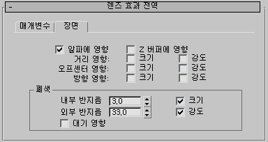 폐색은 효과와 카메라 사이에 오는 오브젝트가 렌즈 효과에 영향을 줄 시기를 결정하는 데 사용됩니다. 두 개의 스피너를 사용하여 폐색을 결정하면 장면 오브젝트가 효과를 사실적으로 표현합니다. 외부 반지름은 다른 장면 오브젝트의 폐색 시작 시기를 결정하고, 내부 반지름은 장면 오브젝트가 효과를 최대 폐색에 도달하게 할 시기를 결정합니다.