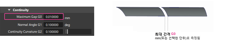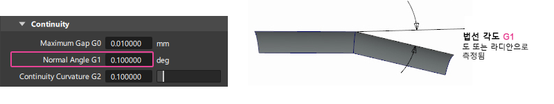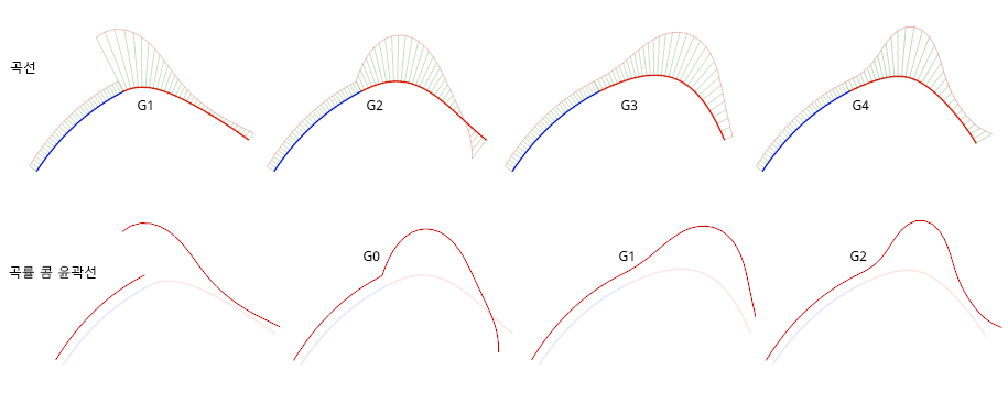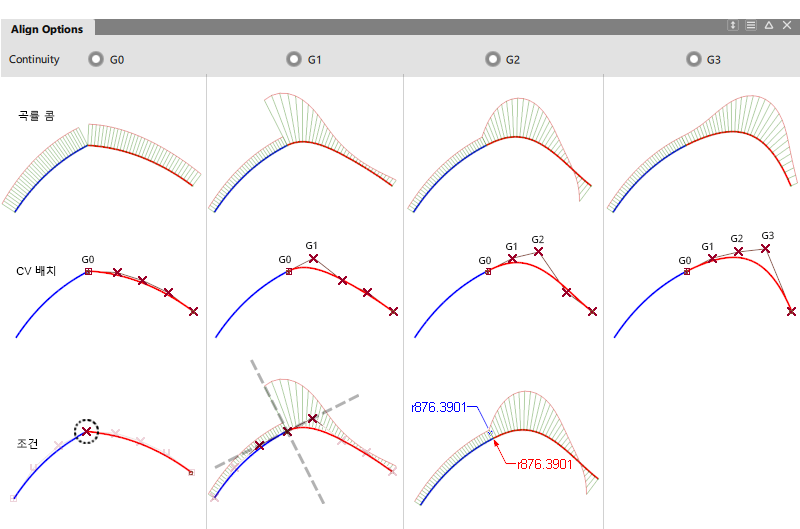 연속성 설정 G0, G1, G2, G3은 인접한 곡선 또는 서페이스 패치 사이의 부드러운 정도를 지정합니다.