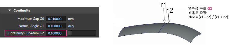 경계에서 G2 곡률 편차 계산은 (음수 값 무시): dev = (R1 - R2) / (R1 + R2) 입니다.