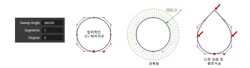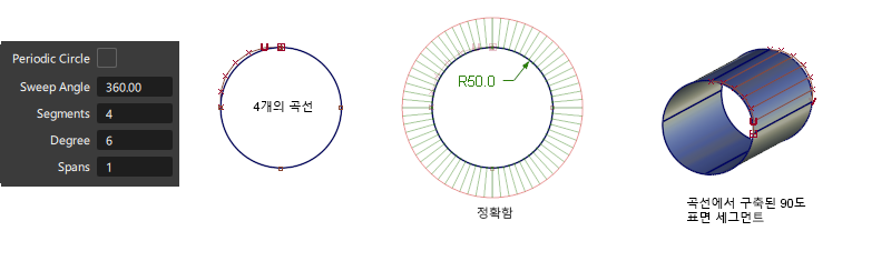 4개의 세그먼트를 가진 정확한 원(비주기) - 정확한 원과 원통형 쉐이프를 만드는 데 권장하는 방법입니다. 정확도를 보장하려면 차수가 6 이상이어야 합니다.