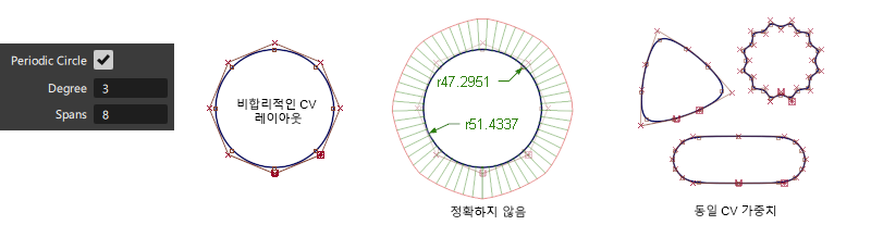 이렇게 하면 각 CV가 곡선이나 서페이스에 동일한 영향을 미쳐 쉐이프에 미치는 영향을 더 쉽게 예측할 수 있다는 장점이 있습니다. 비유리 형상의 유일한 단점은 주기 원 및 회전(원추)에 대해 원형 정확도를 생성할 수 없다는 것입니다.