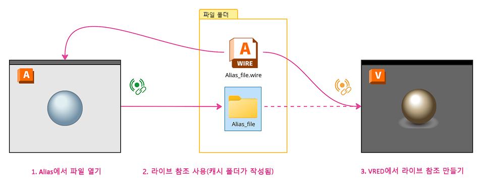 라이브 참조는 현재 로드된 .wire 파일을 사용하여 Alias에서 시작합니다. 파일에 대해 이 기능을 활성화하면 데이터의 임시 캐시(.alvred) 버전이 생성되어 VRED에서 사용할 수 있습니다. VRED에서 라이브 참조를 생성해 캐시에 대한 라이브 연결을 설정합니다. 이제 데이터가 추가 수정 없이도 두 응용프로그램에서 동일하게 표시됩니다. 따라서 Alias 모델러는 VRED 시각화 전문가에게 실시간으로 데이터를 전송할 수 있습니다.