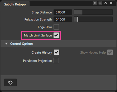 Subdiv Retopo 툴에 새로운 Match Limit Surface 옵션이 추가되었습니다. Match Limit Surface 옵션을 켜면 Retopo 툴은 입력 형상에 제어 케이지 정점을 배치하는 대신에 입력 형상에 제한 서페이스를 배치하려고 시도합니다. 이 기능은 Subdiv Reform 및 Subdiv Align to Curve 툴에서 사용할 수 있습니다.
