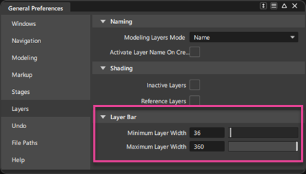 이제 새로운 Minimum Layer Width 및 Maximum Layer Width 기본 설정을 사용하여 Layer Bar에서 도면층 표시 폭을 사용자화할 수 있습니다. 장면에 도면층이 여러 개 있는 경우 도면층 막대를 짧게 만들거나 도면층이 적게 있는 경우 도면층 막대를 길게 만드는 데 이 설정을 사용합니다. Preferences > General Preferences > Layers > Layer Bar에서 이러한 기본 설정을 설정할 수 있습니다.
