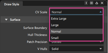 Display > Draw Style 옵션에 새로운 CV Scale 추가되어 4가지 다른 CV 크기 중에서 선택할 수 있습니다. 새로운 더 큰 그리기 크기는 고해상도 모니터에서 가시성을 올리고자 작업할 때 특히 도움이 됩니다. 이 설정은 곡선, NURBS 서페이스 및 서브디비전 객체 CV에 영향을 주는 전역 설정입니다.
