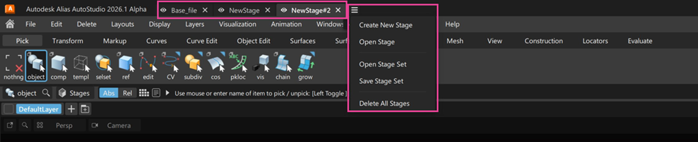 이제 Alias에서 파일을 열 때 응용프로그램 창 상단에 파일 이름이 표시되는 탭이 있습니다. 스테이지가 상단에 표시되어 드롭다운 메뉴에서 Stage Editor 옵션에 액세스할 수 있습니다. Alt 키를 누른 상태에서 탭을 클릭해도 Stage Editor에서와 마찬가지로 스테이지가 분리됩니다. 작업 막대에 있는 Stages 버튼을 통해 Stage Editor에 계속 액세스할 수 있습니다.