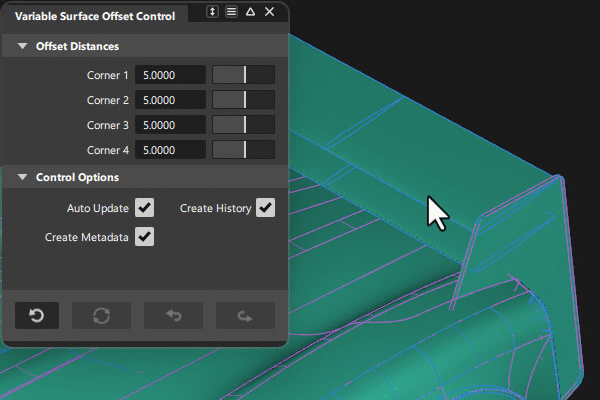 이 툴을 사용하면 서페이스의 모서리를 기준으로 간격띄우기 거리를 지정할 수 있습니다. 이 툴을 사용하여 잘리지 않은 서페이스에서 간격띄우기를 생성할 수 있습니다. 결과 서페이스의 각 모서리에 대한 간격띄우기 거리를 정의하려면 Offset Surface 컨트롤을 사용하세요.