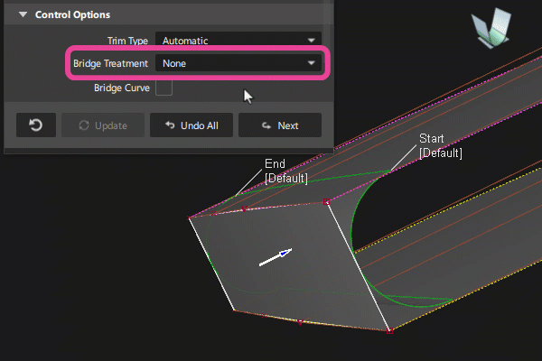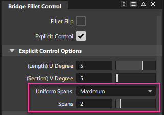 이제 Bridge Fillet 툴에 Surface Fillet 툴과 동일한 Explicit Control Options가 포함되어 있습니다. 여기에는 Uniform Spans 옵션의 추가 사항이 포함됩니다.
