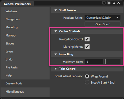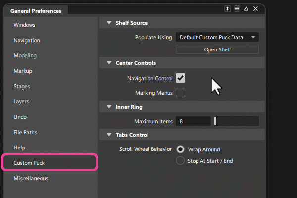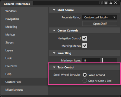General Preferences > Custom Puck의 새로운 Tab Control 기본 설정을 사용하면 마우스 가운데 휠로 가운데 탭을 스크롤하는 방법을 선택할 수 있습니다. 이제 다음 옵션 중에서 선택할 수 있습니다.
