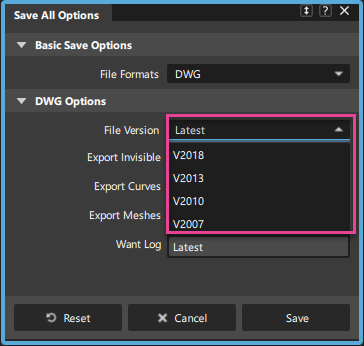 이제 파일을 내보낼 때 사용할 .dwg 파일 형식의 버전을 선택할 수 있습니다. DWG Options에는 최신 버전, V2018, V2013, V2010 및 V2007 버전에 대한 액세스를 제공하는 새로운 File Formats 드롭다운 목록이 포함되어 있습니다.
