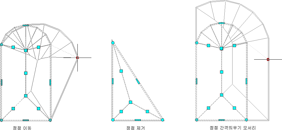 모서리 그립에는 간격띄우기, 정점 추가, 호로 변환, 선으로 변환 및 신축의 5가지 편집 모드가 있습니다.