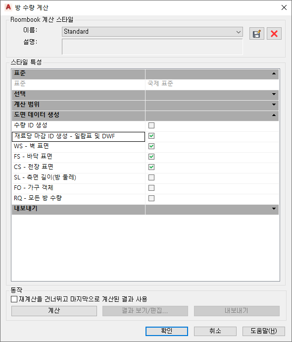 - 방 수량 계산 대화상자의 스타일 특성 아래, 도면 데이터 생성 리스트에서 재료당 마감 ID 생성을 선택합니다.