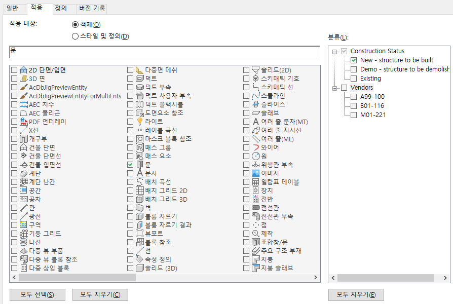 객체 또는 스타일 및 정의(예: 다중 뷰 블록 정의)에 대해 특성 세트 정의를 작성할 수 있습니다. 객체의 복제별로 달라질 수 있는 수동 특성은 객체에 의해 적용되는 객체 기반 특성 세트 정의에 속합니다.