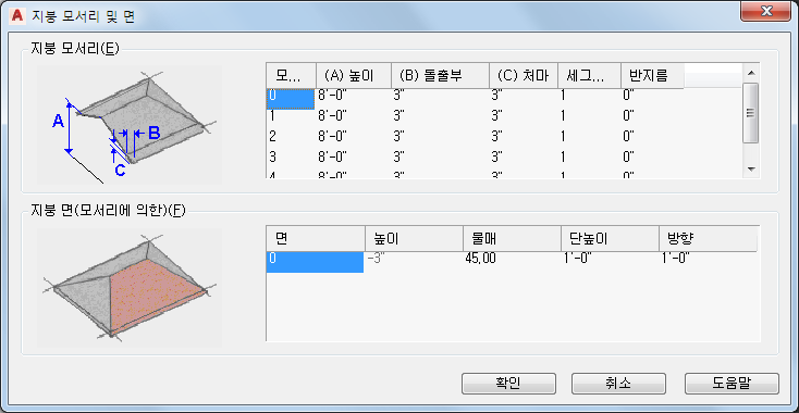 | 선택된 모서리에 면 추가 | 면 열의 마지막 숫자 아래의 공백을 클릭한 후 높이 및 물매에 값을 입력합니다. |
