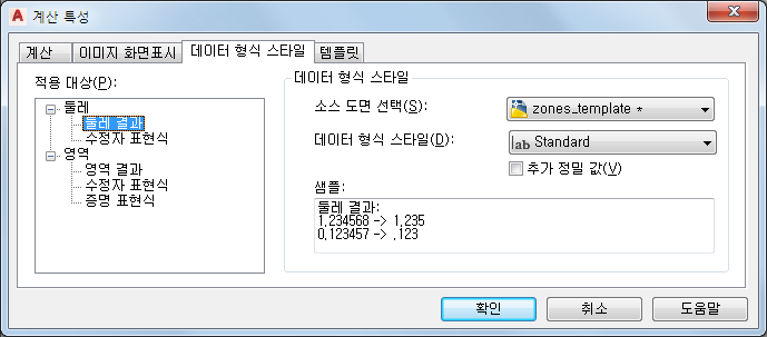 영역 또는 둘레 결과가 데이터 형식 스타일에 설정된 정밀도로 표시되며, 추가 열에 반올림되지 않은 정확한 값이 표시됩니다.