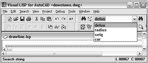 - In Visual LISP, on the Search toolbar, click the drop-down list and select a search term.