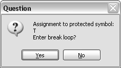 Click Yes to interrupt processing and enter a Visual LISP break loop. Control switches to the Visual LISP Console window. To set the symbol and continue processing, click the Continue button on the Visual LISP toolbar; to abort modification, click Reset. If you click No, the symbol's value is modified, and processing continues normally.