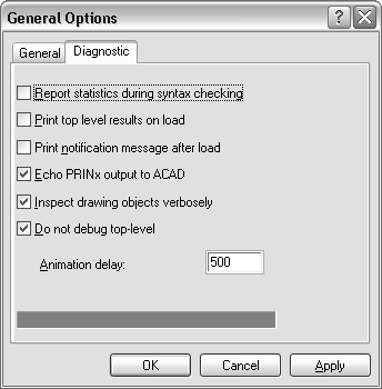 On the Visual LISP Tools menu, on the Environment Options submenu, the General Options option displays the General Options dialog box. In the General Options dialog box, on the Diagnostic tab, the options control how Visual LISP provides information about AutoLISP syntax.