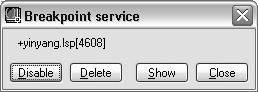 - In the Visual LISP text editor window, place the cursor at the breakpoint marker and right-click. Click Breakpoint Service.