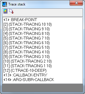 As an example, load the following code in Visual LISP, set a breakpoint as indicated in the code comments, and then start the TRACE-10-DEEP command.