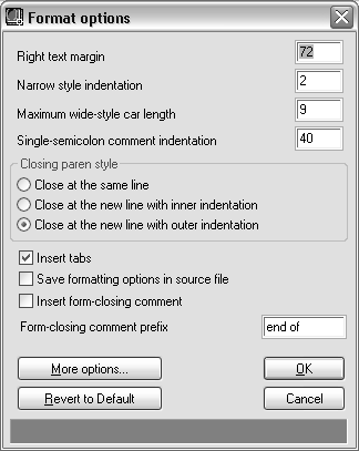 On the Visual LISP Tools menu, on the Environment Options submenu, the Visual LISP Format Options option displays the Format Options dialog box, which is used to set formatting and indentation options.