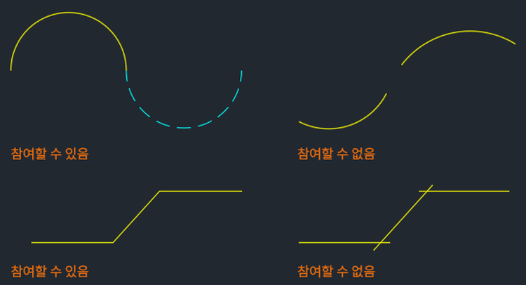 여러 선을 선택할 수 있습니다. 객체가 끝과 끝이 접하지 않거나 동일선상에 있지 않으면 JOIN 명령 수행 시 객체를 무시합니다.