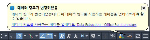 팁: 도면에 있는 하나 이상의 테이블에 추출된 데이터가 포함되는 경우 AutoCAD 응용프로그램 윈도우의 시스템 트레이에 데이터 링크 아이콘이 표시됩니다. 이 아이콘이 표시되면 아이콘을 마우스 오른쪽 버튼으로 클릭하여 도면의 데이터 링크를 관리 및 업데이트할 수 있습니다. DATALINKNOTIFY 시스템 변수는 데이터 링크 아이콘의 모양 및 기능을 조정합니다.