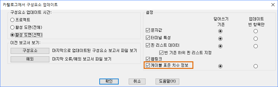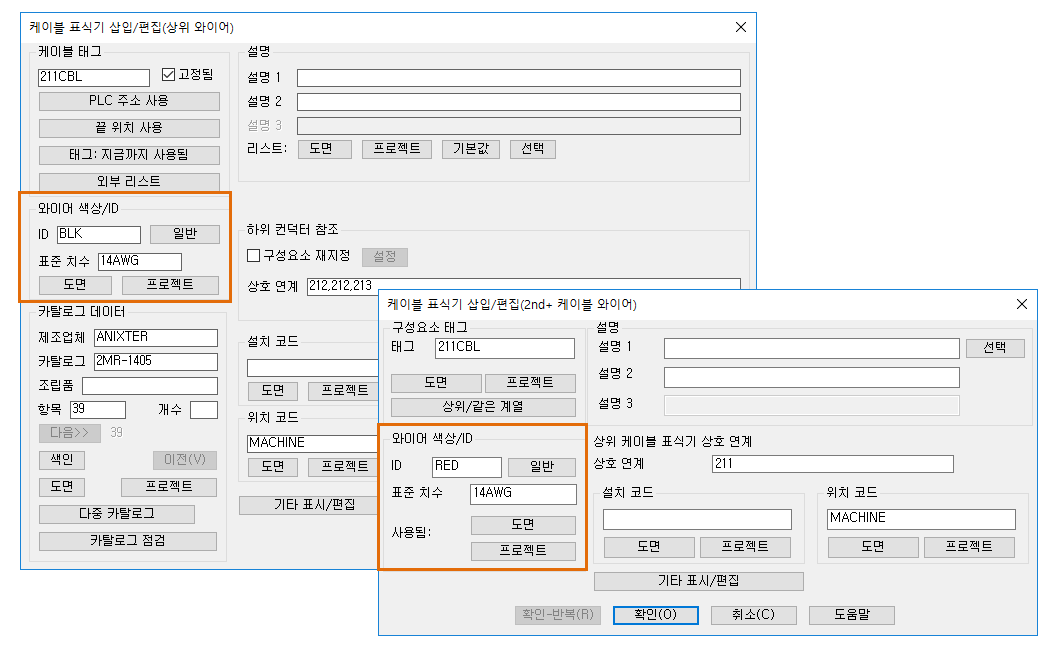 - 블록을 교체한 후 AEUPDFROMCAT를 사용하여 케이블 표준 치수 정보를 선택할 수 있습니다. 이렇게 하면 미리 정의된 컨덕터 리스트에서 케이블 표식기의 케이블 표준 치수 값이 지정된 카탈로그 번호에 대한 카탈로그 데이터베이스의 값과 일치하도록 업데이트됩니다. 이 업데이트를 수행하려면 와이어 색상/ID가 해당 케이블 표식기에 이미 지정되어 있어야 합니다.