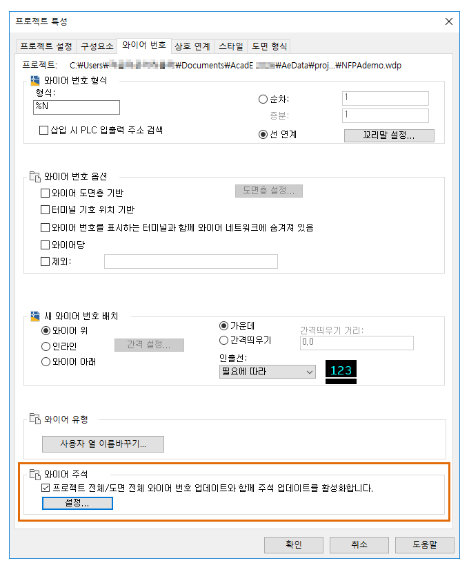 와이어 주석 섹션에서 프로젝트 전체 또는 도면 전체 와이어 번호 업데이트와 함께 주석 업데이트를 사용하도록 확인란을 선택합니다.