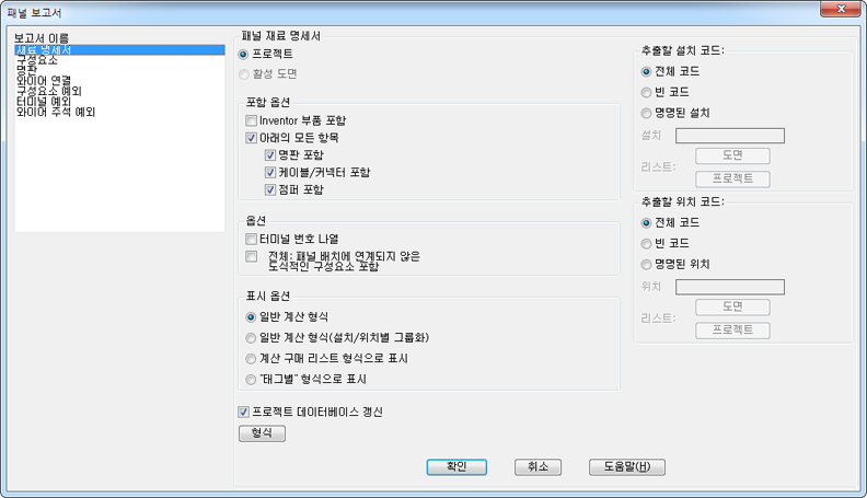 프로젝트, 활성 도면 또는 선택한 객체 중에서 처리할 대상을 지정합니다. 프로젝트가 선택되면 일부 보고서에서는 처리할 도면을 선택할 수 있는 옵션이 제공됩니다.