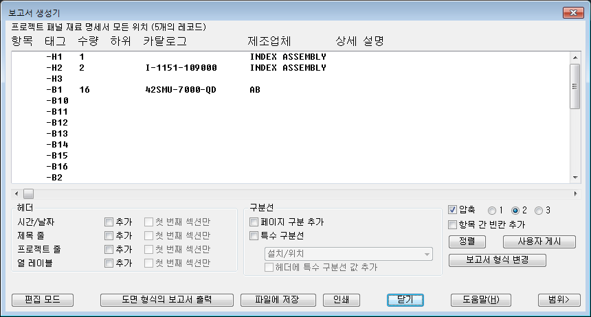 보고서를 생성하고 나서, 보고서 생성기 대화상자에서 도면 형식의 보고서 출력을 클릭하여 보고서를 테이블로 삽입합니다. 테이블 생성 설정 대화상자의 옵션을 사용하여 다음을 수행할 수 있습니다.