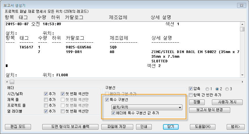 특수 구분선을 선택하고 도면 형식의 보고서 출력을 클릭한 후 테이블 생성 설정 대화상자에서 특수 구분선 적용 옵션을 사용할 수 있습니다. 이 옵션을 사용하면 특수 구분선을 기준으로 각 섹션에 대한 테이블 객체를 삽입할 수 있습니다.