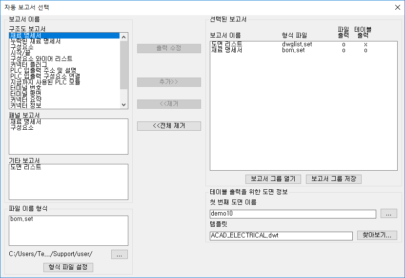 실행하려는 각 보고서의 보고서 이름 및 형식 파일(.set)을 선택합니다. 형식 파일은 파일 출력 또는 테이블 출력을 정의하거나, 둘 다 정의하기도 합니다.