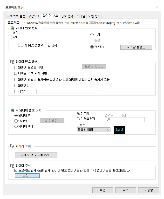 - 와이어 번호 도면층 옵션을 설정합니다.
