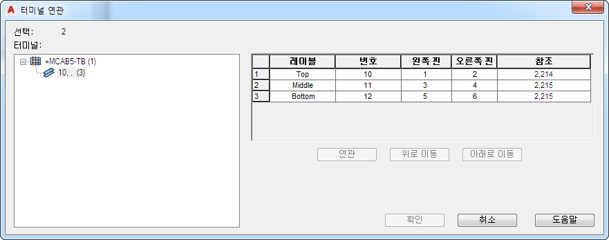 주: 카탈로그 색인을 클릭하여 예비용 터미널 삽입 대화상자에서 예비용 터미널에 대한 카탈로그 정보를 지정할 수도 있습니다. 그런 다음 필요한 경우 카탈로그 검색기 대화상자에서 부품을 선택할 수 있습니다.