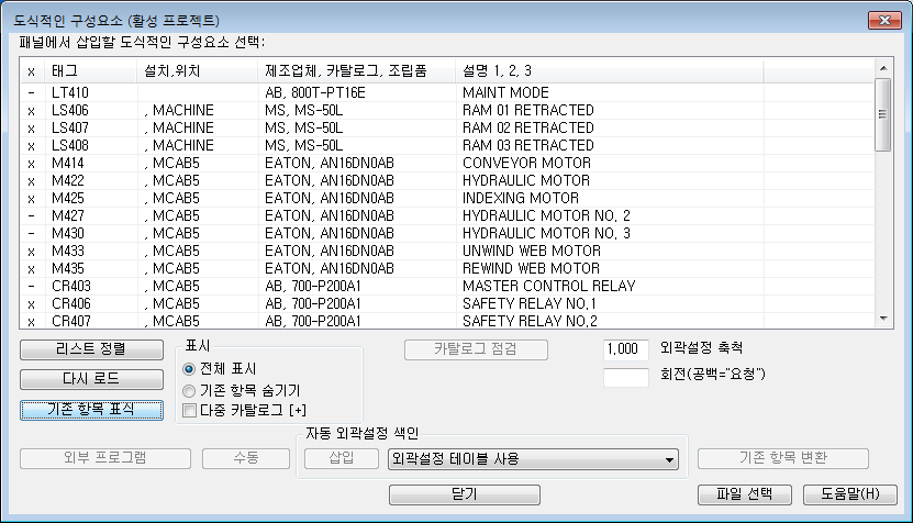 주: 수동 버튼은 도식적인 구성요소 외곽설정에 제조업체 및 카탈로그 번호가 정의되지 않은 경우 사용합니다.