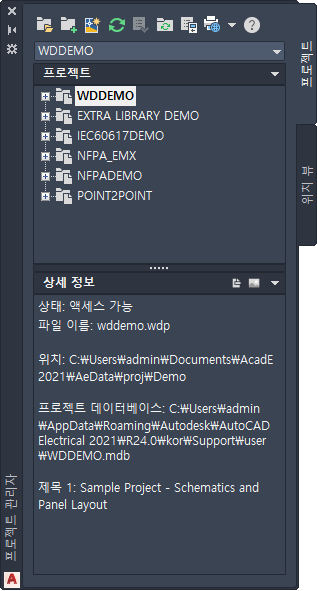 AutoCAD Electrical 도구 세트는 프로젝트 기반 시스템입니다. 확장자가 .wdp인 ASCII 문자가 각 프로젝트를 정의합니다. 이 프로젝트 파일에는 프로젝트 정보, 기본 프로젝트 설정, 도면 특성, 도면 파일 이름의 리스트가 있습니다. 사용할 수 있는 프로젝트 수에는 제한이 없지만 한 번에 한 개의 프로젝트만 활성화할 수 있습니다.