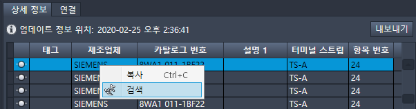 4. 와이어 번호를 검색하려면 상세 정보 및 연결 표시 를 클릭하고 연결 탭을 클릭합니다. 행 또는 행 그룹을 선택한 후 마우스 오른쪽 버튼으로 클릭하고 검색을 선택합니다.
