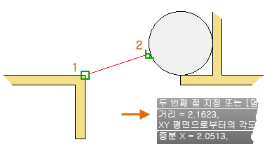 DIST를 입력한 후에 구석 (1)의 끝점을 클릭합니다. 그런 다음, Shift 키를 누른 채 마우스 오른쪽 버튼을 클릭한 후 객체 스냅 메뉴에서 수직을 선택합니다. 마지막으로, 원 (2)를 클릭합니다.