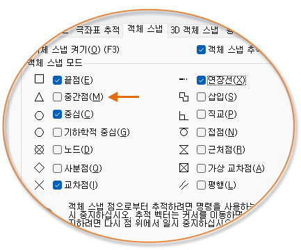 기본 객체 스냅("활성" 객체 스냅이라고도 함)을 설정하려면 OSNAP 명령을 입력합니다. 예를 들어 기본적으로 중간점 객체 스냅을 켜는 것이 유용하다고 느낄 수도 있습니다.