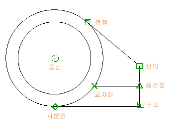 객체에서 정확한 위치를 지정할 수 있는 가장 중요한 방법은 객체 스냅을 사용하는 것입니다. 다음 그림에서는 여러 종류의 객체 스냅이 표식기로 표시되어 있습니다.