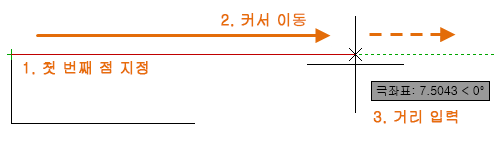 예를 들어, 아래 선의 첫 번째 점을 지정하고 커서를 오른쪽으로 이동한 다음 명령 윈도우에 거리를 입력하여 선의 정확한 수평 길이를 지정합니다.
