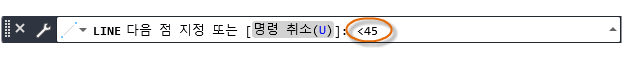 지정된 각도로 선을 그려야 하는 경우 다음 점에 대한 각도를 잠글 수 있습니다. 예를 들어, 선의 두 번째 점을 45도 각도로 작성해야 하는 경우, 명령 윈도우에 <45를 입력합니다.