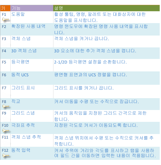 키보드 기능 키는 모두 AutoCAD에서 지정됩니다. 가장 일반적으로 켜고 끄는 기능은 키로 표시됩니다.