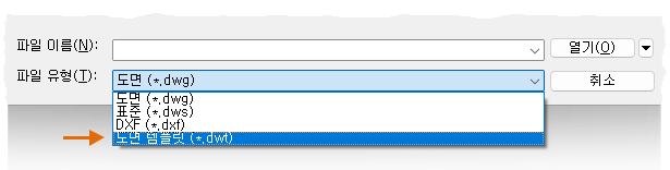 독립적으로 작업하는 경우 작업 기본 설정에 맞게 도면 템플릿 파일을 개발한 후 추가 피쳐에 대한 설정에 익숙해지면 그러한 설정을 추가할 수 있습니다. 기존 도면 템플릿 파일을 수정하려면 열기를 클릭하고 파일 선택 대화상자에서 도면 템플릿(*.dwt)을 지정한 후에 도면 템플릿 파일을 선택합니다.