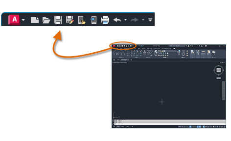 AutoCAD의 응용프로그램 위쪽에는 표준 탭 리본이 있습니다. 홈 탭에서 이 안내서에 나오는 거의 모든 명령에 액세스할 수 있습니다. 또한 아래에 표시된 빠른 액세스 도구 모음에는 새로 만들기, 열기, 저장, 인쇄 및 명령취소 등의 자주 사용되는 명령이 포함되어 있습니다.