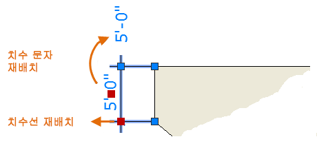 이 예에서는 치수를 선택하여 해당 그립을 표시합니다. 그런 다음 치수 문자의 그립을 클릭하고 새 위치로 끌거나, 치수선의 끝에 있는 그립 중 하나를 클릭하고 치수선을 끕니다.