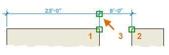 아래 8'-0" 치수에 대해서는 다른 방법을 사용합니다. DIM 명령을 시작하고 두 끝점 (1, 2)를 클릭한 다음 치수선 (3)의 위치를 클릭합니다. 치수선을 일렬로 맞추기 위해 점 3이 이전에 작성한 치수선의 끝점으로 스냅되었습니다.